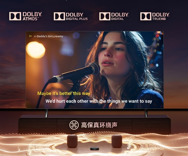 获得杜比认证,支持杜比全景声(Dolby Atmos)与杜比视界(Dolby Vision),配合8K解码、4K AI-SR超分算法、AV1解码、HDR10+等技术,画面细节丰富、色彩精准,声音沉浸感十足,打造家庭影院级视听。