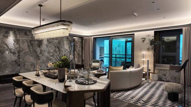 样板间是做了横厅设计,实际交付为4房,这个横厅连同书房面宽约6.9米,仅客厅面宽约为4.2米;电视机背景墙是雪山蓝岩板,也是交付的;室内地面的材质铺装选用1.8米*90公分的大砖密拼而成,几乎看不到缝隙;包含阳台移门在内,所有窗户均为三玻两腔。