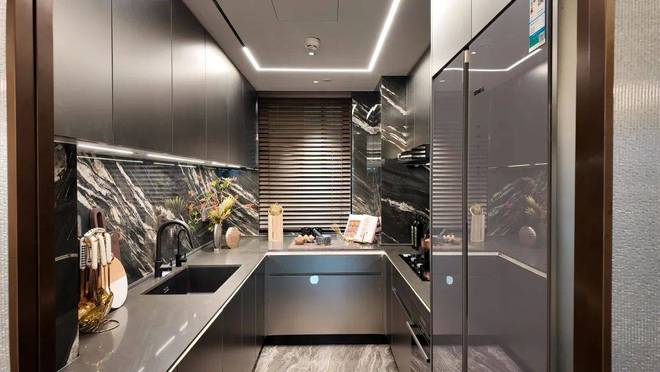 U型厨房,借了一部分飘窗因此纵深较长,但面宽相较于同面积段产品来说还是小了点。油烟机、燃气灶、烤箱和15件套洗碗机均为博世(或同等品牌);冰箱西门子双开门冰箱(或同等品牌),105㎡是单开门冰箱;水槽和龙头都是铂浪高(或同等品牌),还有康丽根(或同等品牌)净水器。