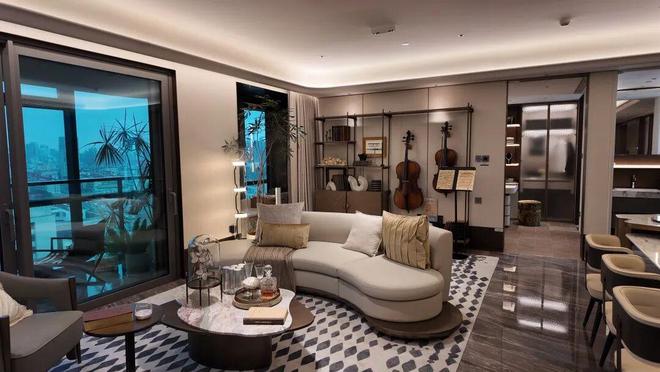 样板间是做了横厅设计,实际交付为4房,这个横厅连同书房面宽约6.9米,仅客厅面宽约为4.2米;电视机背景墙是雪山蓝岩板,也是交付的;室内地面的材质铺装选用1.8米*90公分的大砖密拼而成,几乎看不到缝隙;包含阳台移门在内,所有窗户均为三玻两腔。