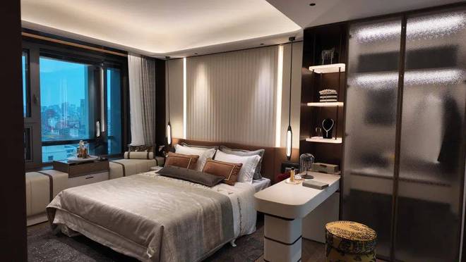 样板间是做了横厅设计,实际交付为4房,这个横厅连同书房面宽约6.9米,仅客厅面宽约为4.2米;电视机背景墙是雪山蓝岩板,也是交付的;室内地面的材质铺装选用1.8米*90公分的大砖密拼而成,几乎看不到缝隙;包含阳台移门在内,所有窗户均为三玻两腔。